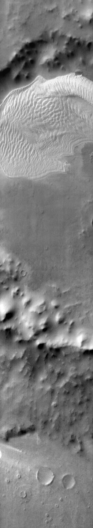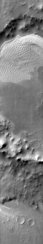 Note: this THEMIS visual image has not been radiometrically nor geometrically calibrated for this preliminary release. An empirical correction has been performed to remove instrumental effects. A linear shift has been applied in the cross-track and down-track direction to approximate spacecraft and planetary motion. Fully calibrated and geometrically projected images will be released through the Planetary Data System in accordance with Project policies at a later time.