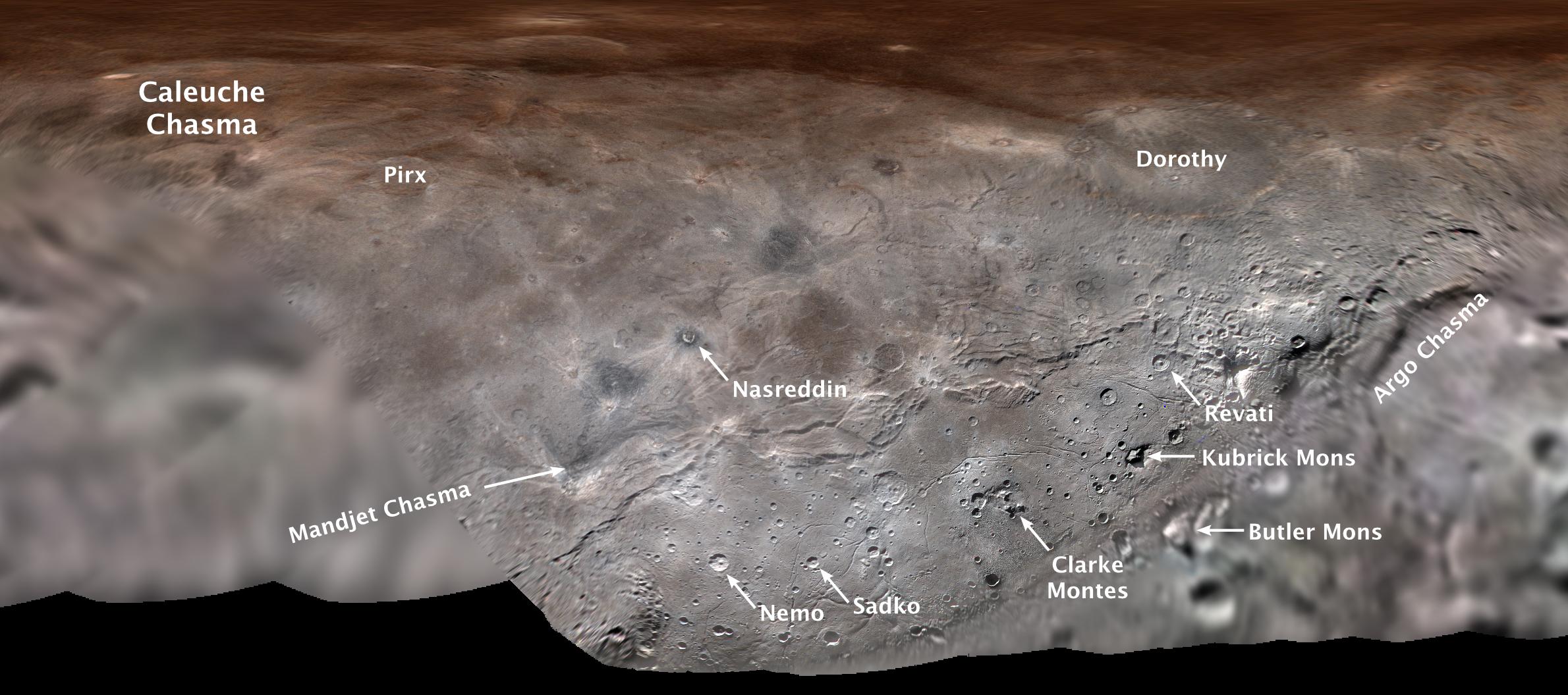 Map projection of Charon, the largest of Pluto's five moons, annotated with its first set of official feature names. With a diameter of about 755 miles, the Texas-sized moon is one of largest known objects in the Kuiper Belt, the region of icy, rocky bodies beyond Neptune.