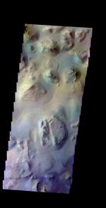 The THEMIS camera contains 5 filters. The data from different filters can be combined in multiple ways to create a false color image. These false color images may reveal subtle variations of the surface not easily identified in a single band image. Today's false color image shows a region of chaos in Eos Chasma.