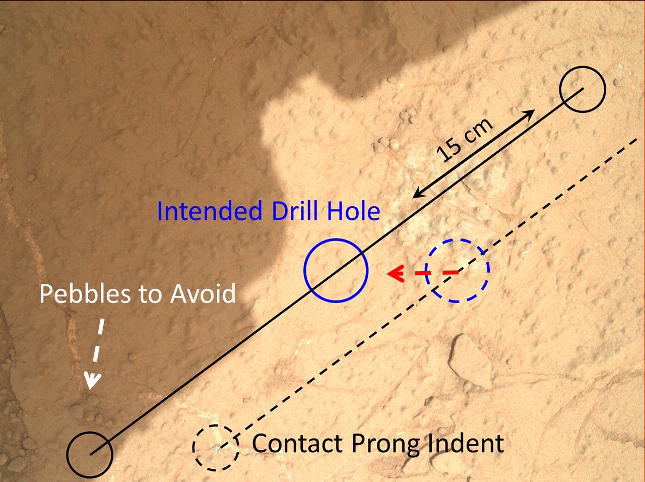 This image demonstrates how engineers place the drill carried by NASA's Mars rover Curiosity onto rock targets. They first set down the drill's two stabilizing prongs near the target, as shown by the dashed line. From there, they assess the placement of the prongs in relation to the target to determine the correct, final placement of the drill. This approach allows for higher accuracy, both to hit the target and avoid placing a prong on unstable areas or pebbles.