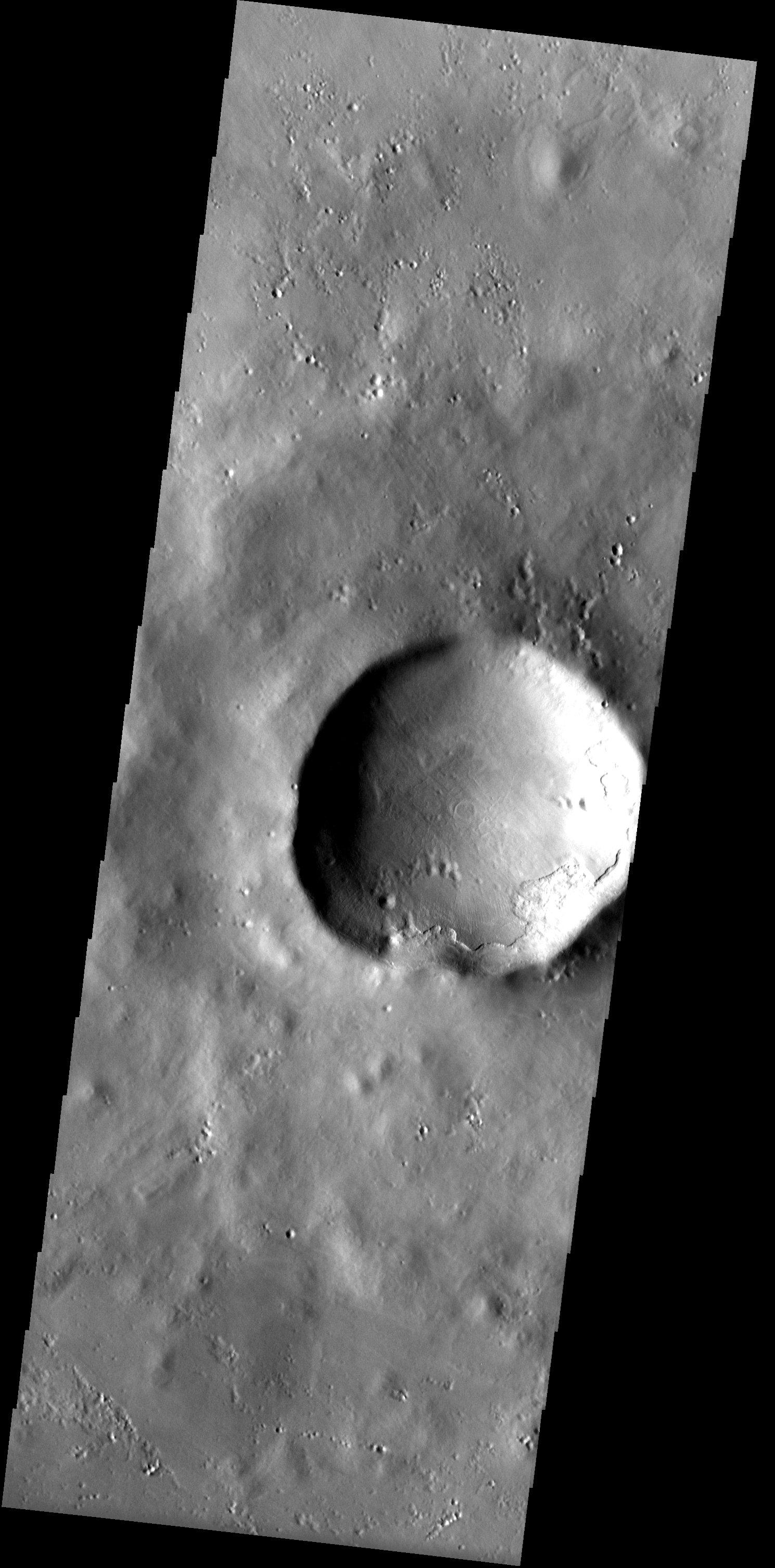 Note: this THEMIS visual image has not been radiometrically nor geometrically calibrated for this preliminary release. An empirical correction has been performed to remove instrumental effects. A linear shift has been applied in the cross-track and down-track direction to approximate spacecraft and planetary motion. Fully calibrated and geometrically projected images will be released through the Planetary Data System in accordance with Project policies at a later time.