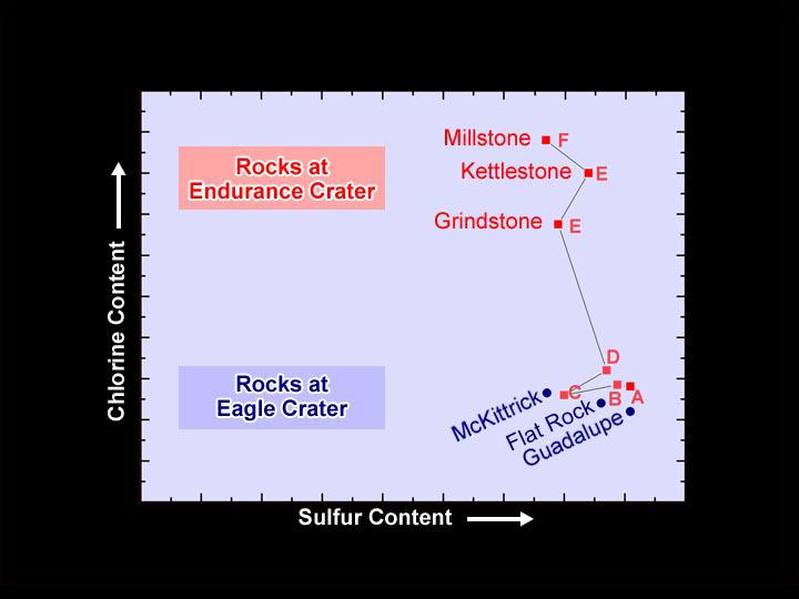 The observations indicate that the elements making up the shallow rock layers of Endurance Crater resemble those of Eagle, while the deeper layers of Endurance possess increasingly higher concentrations of the element chlorine.
