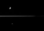 Cassini has Mimas (397 kilometers, or 247 miles across, at bottom) and Pandora (84 kilometers, or 52 miles across, at center left) on its side as it gazes across the ringplane at distant Tethys (1,071 kilometers, or 665 miles across, at top). The two smaller moons were on the side of the rings closer to Cassini when this image was taken. Little structure is visible on the moons, aside from a stippling of craters.