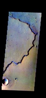 The THEMIS VIS camera contains 5 filters. The data from different filters can be combined in multiple ways to create a false color image. These false color images may reveal subtle variations of the surface not easily identified in a single band image. Today's false color image shows part of the margin of Chryse Planitia. Dark blue in this false color combination is mostly likely basaltic material/dunes.