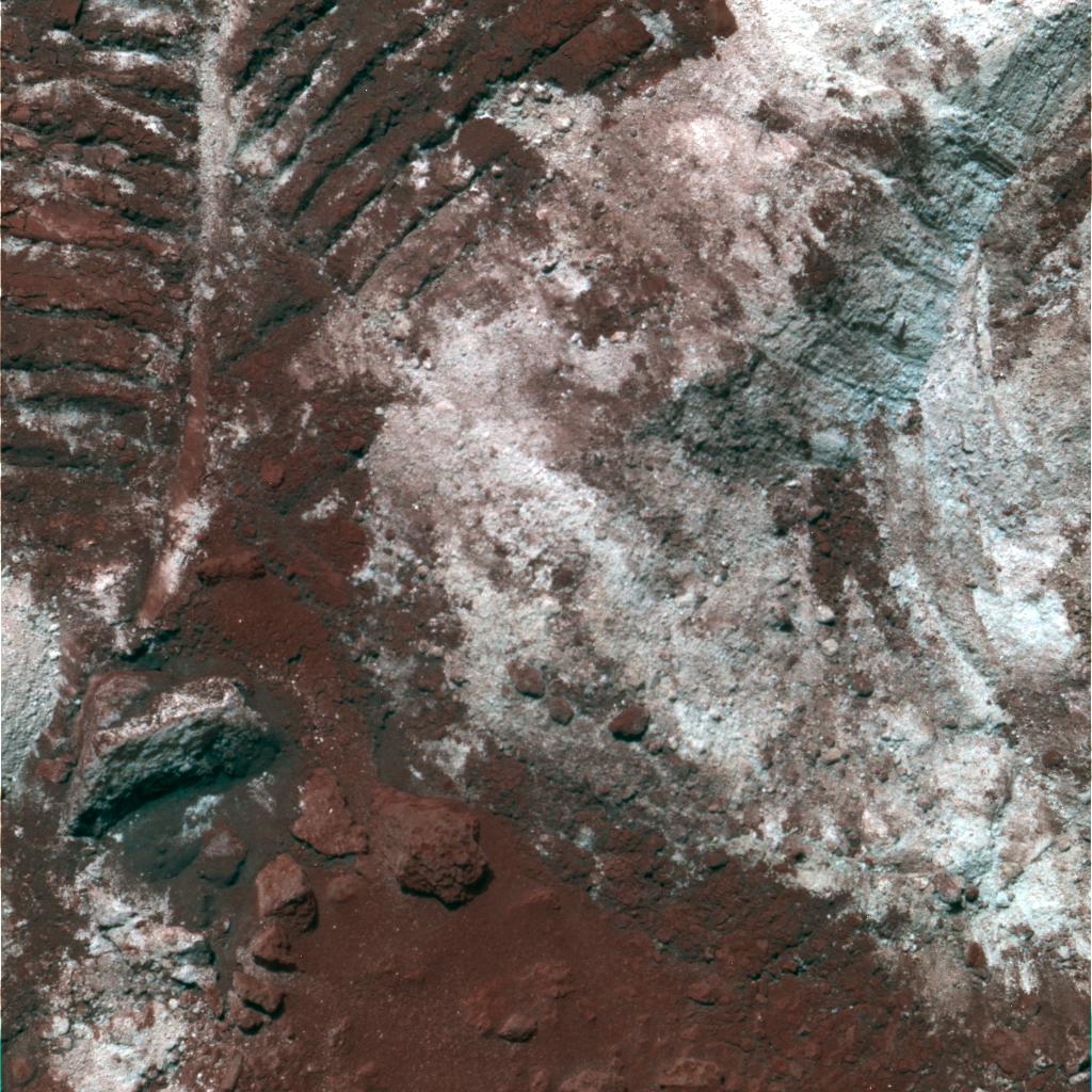 NASA's Mars Exploration Rover Spirit has been analyzing sulfur-rich rocks and surface materials in the "Columbia Hills" in Gusev Crater on Mars. This image shows rocky debris and dust, which planetary scientists call "regolith" or "soil," that has been churned up by the rover wheels. This 40-centimeter-wide (16-inch-wide) patch of churned-up dirt, nicknamed "Paso Robles," contains brighter patches measured to be high in sulfur by Spirit's alpha particle X-ray Spectrometer. Spirit's panoramic camera took this false-color image on martian day, or sol, 400 (Feb. 16, 2005), using filters at wavelengths of 750, 530, and 430 nanometers. Darker red hues in the image correspond to greater concentrations of oxidized soil and dust. Whiter and bluer hues correspond to sulfur-rich deposits that are not as heavily coated with soils or are not as highly oxidized.