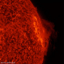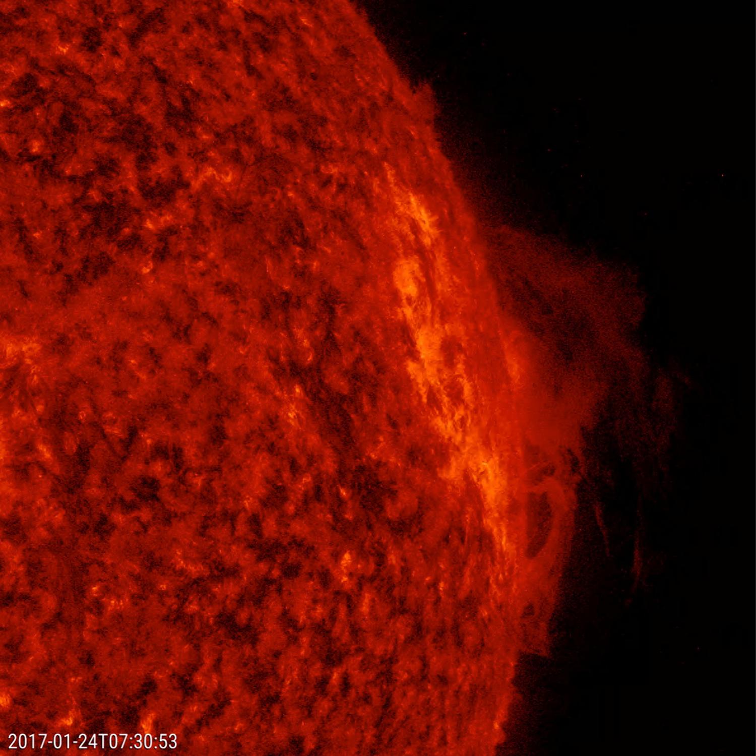 A solar prominence rose up along the edge of the sun and twisted and churned for about two days before falling apart (Jan. 23-24, 2017). The dynamic action was generated by competing magnetic forces. The images were taken in a wavelength extreme ultraviolet light that observes activity close to the solar surface, perfect for capturing prominences, which are notoriously unstable clouds of plasma suspended above the sun.