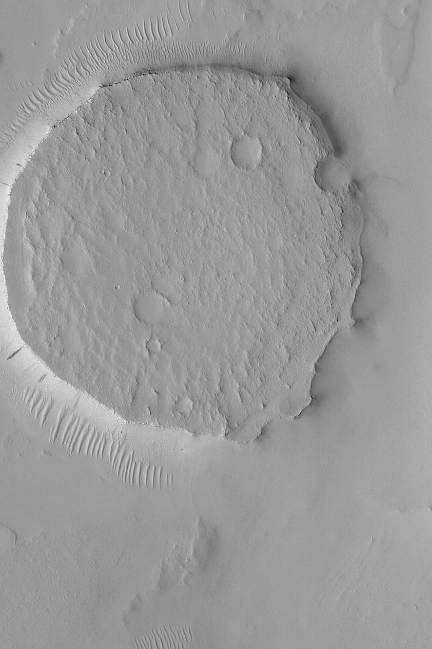 This Mars Global Surveyor (MGS) Mars Orbiter Camera (MOC) image shows a circular mesa in northeast Arabia Terra. The circularity suggests that this landform might be similar to other circular mesas, found elsewhere on Mars. In those other cases, the mesa was once a meteor impact crater. The crater was filled with sediment, the sediment was cemented to become rock, and later erosion removed all of the material surrounding the former crater, leaving it standing alone as a circular mesa. This image is located near 23.7°N, 319.0°W, and covers an area 3 km (1.9 mi) wide. The scene is illuminated by sunlight from the left.