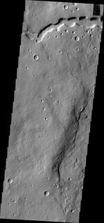 Note: this THEMIS visual image has not been radiometrically nor geometrically calibrated for this preliminary release. An empirical correction has been performed to remove instrumental effects. A linear shift has been applied in the cross-track and down-track direction to approximate spacecraft and planetary motion. Fully calibrated and geometrically projected images will be released through the Planetary Data System in accordance with Project policies at a later time.