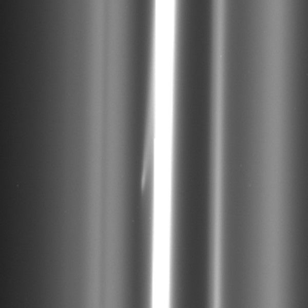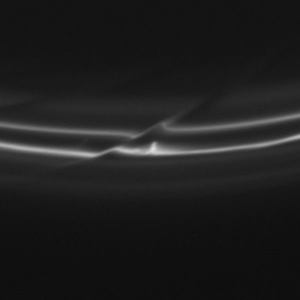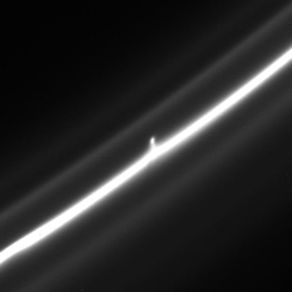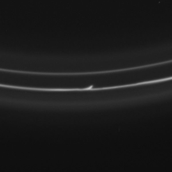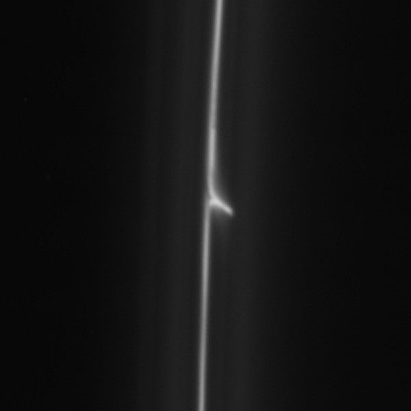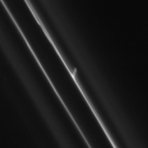 The trails are also called "mini-jets" by Cassini scientists. Scientists believe they were originally formed by the pull of the moon Prometheus, which averages about 53 miles or 86 kilometers across, on tiny F ring particles.