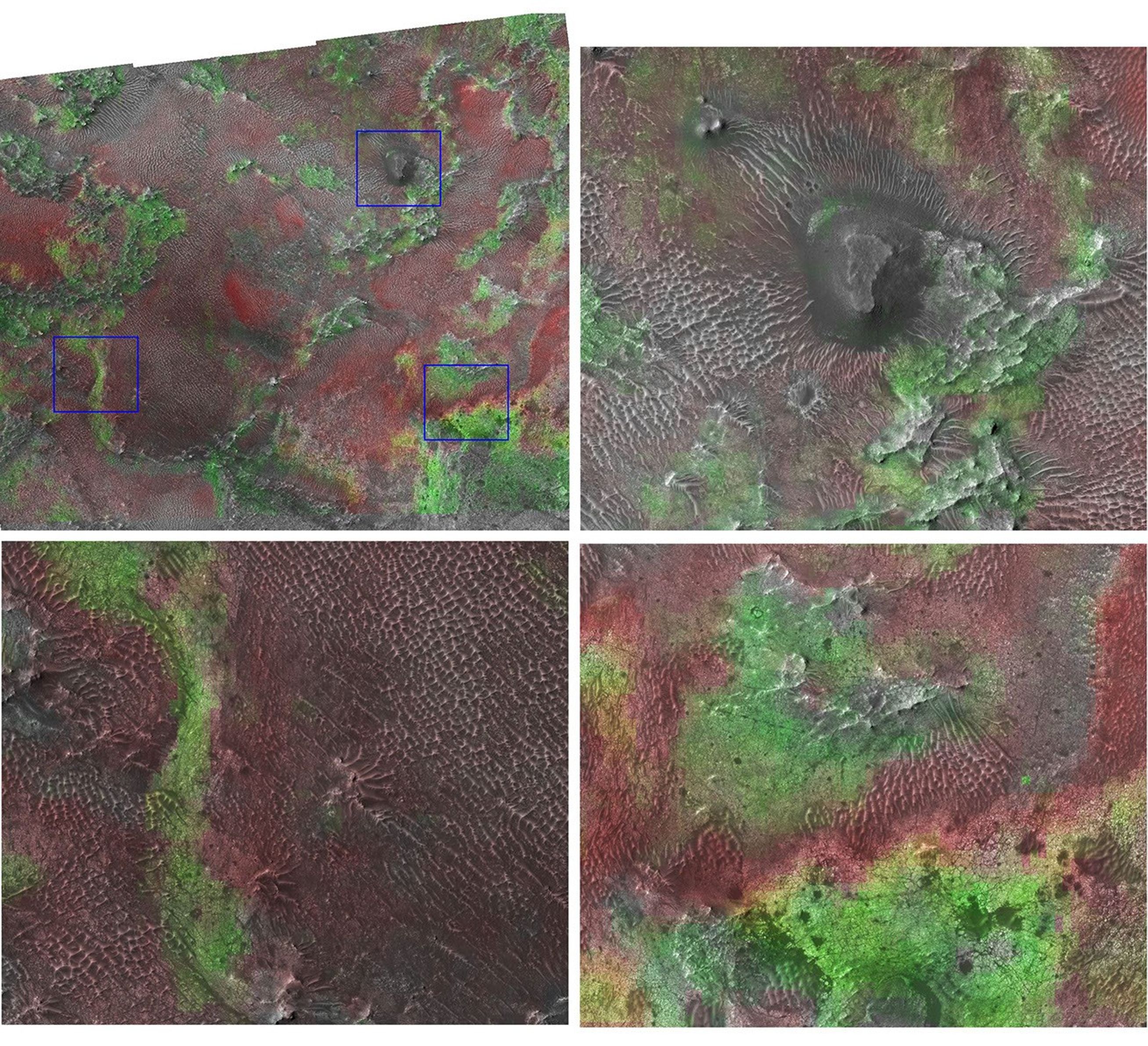 The area where the CRISM and HiRISE data overlap is shown at the upper left, and is about 5 kilometers (3 miles) across. The three boxes outlined in blue are enlarged to show how the different minerals in the scene match up with different landforms. In the image at the upper right, the small mesa -- a flat-topped hill -- at the center of the image is a remnant of an overlying rock layer that was eroded away. The greenish clay areas at the base of the hill were exposed by erosion of the overlying rock. The images at the upper right and lower left both show that the reddish-toned olivine occurs as sand dunes on top of the greenish clay deposits. The image at the lower right shows details of the clay-rich rock, including that they are extensively fractured into small, polygonal blocks just a few meters in size. Taken together, the CRISM and HiRISE data show that the clay-rich rocks are the oldest at the site, that they are exposed where overlying rock has been eroded away, and that the olivine is not part of the clay-rich rock. Rather it occurs in sand dunes blowing across the clay.