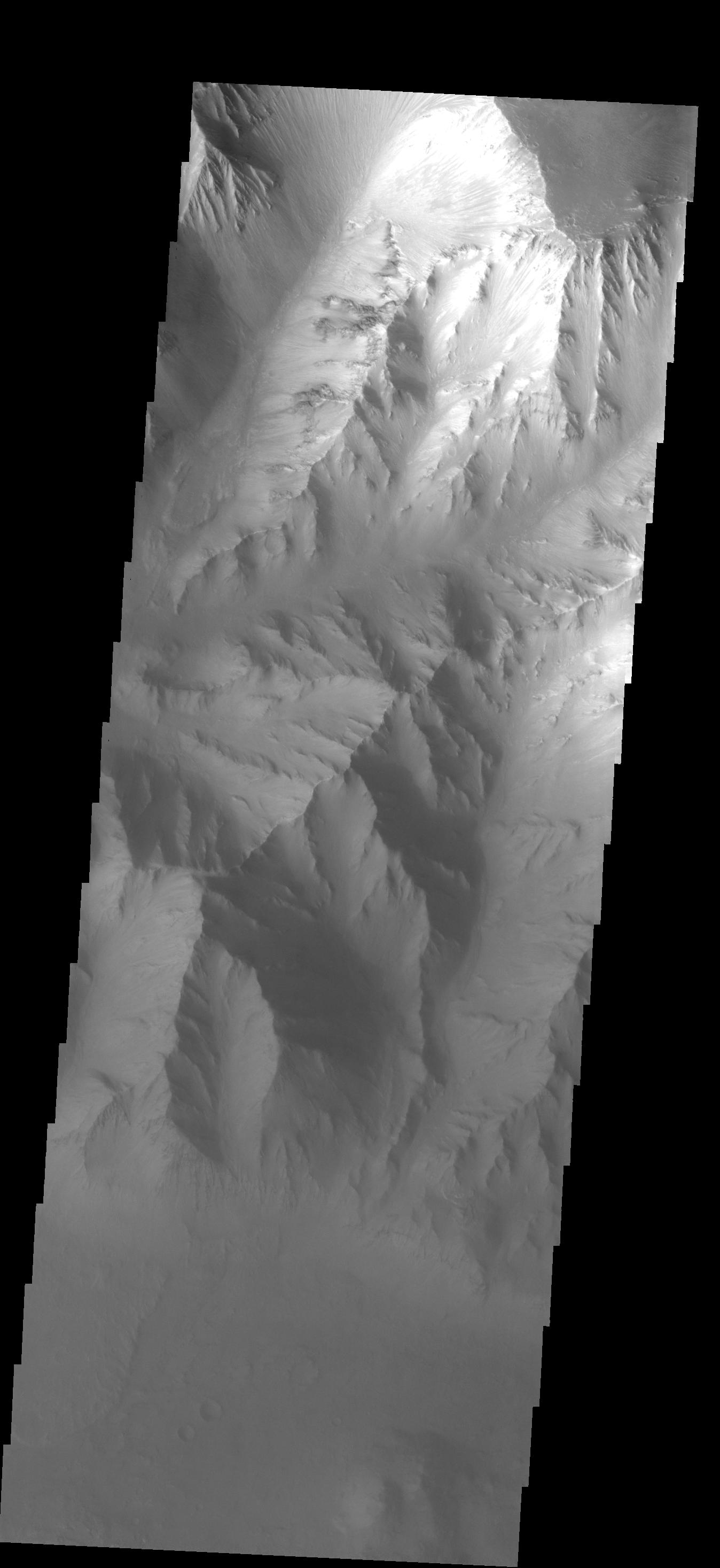 Note: this THEMIS visual image has not been radiometrically nor geometrically calibrated for this preliminary release. An empirical correction has been performed to remove instrumental effects. A linear shift has been applied in the cross-track and down-track direction to approximate spacecraft and planetary motion. Fully calibrated and geometrically projected images will be released through the Planetary Data System in accordance with Project policies at a later time.