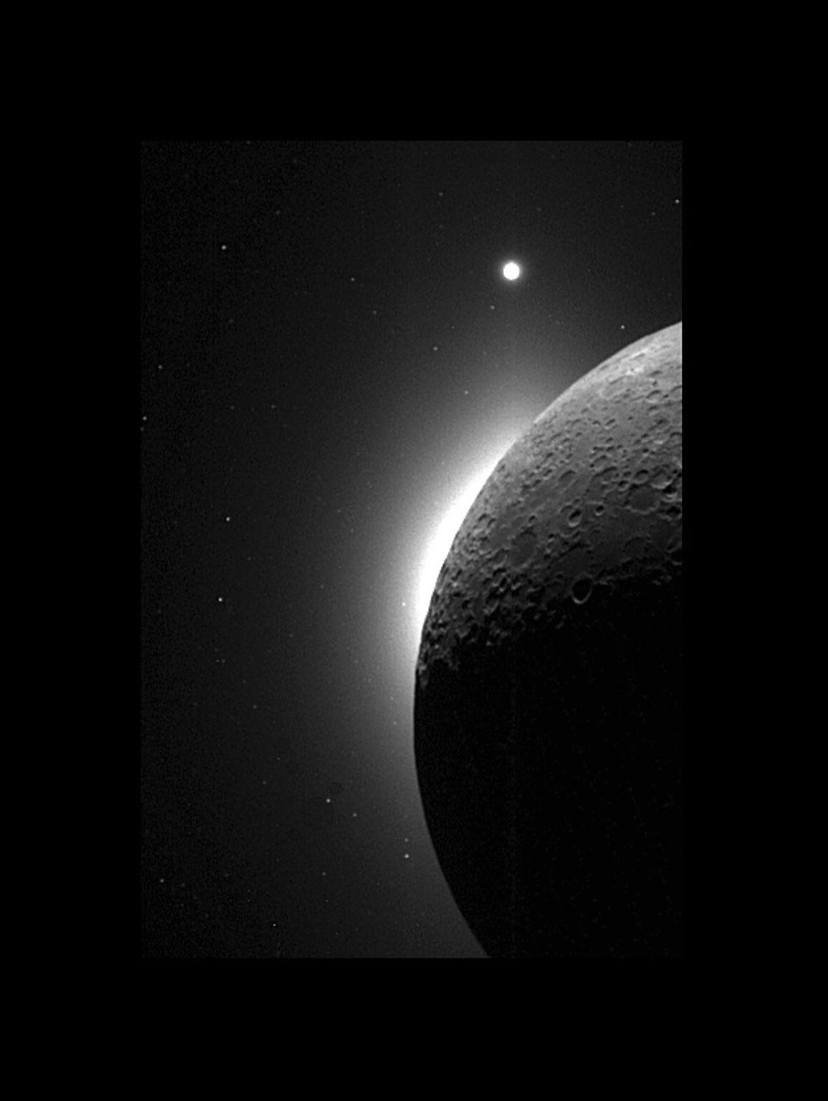 In this picture the Moon is seen illuminated solely by light reflected from the Earth--Earthshine! The bright glow on the lunar horizon is caused by light from the solar corona; the sun is just behind the lunar limb. Caught in this image is the planet Venus at the top of the frame.