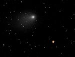 The Mars and comet images have been added together to create a single picture to illustrate the angular separation, or distance, between the comet and Mars at closest approach. The separation is approximately 1.5 arc minutes, or one-twentieth of the angular diameter of the full Moon. The background starfield in this composite image is synthesized from ground-based telescope data provided by the Palomar Digital Sky Survey, which has been reprocessed to approximate Hubble's resolution. The solid icy comet nucleus is too small to be resolved in the Hubble picture. The comet's bright coma, a diffuse cloud of dust enshrouding the nucleus, and a dusty tail, are clearly visible.