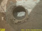 The test generated a ring of powdered rock for inspection in advance of the rover's first full drilling. The hole is 0.63 inch (1.6 centimeters) in diameter and about 0.8 (2 centimeters) deep. MAHLI took this image from a position 2 inches (5 centimeters) away.