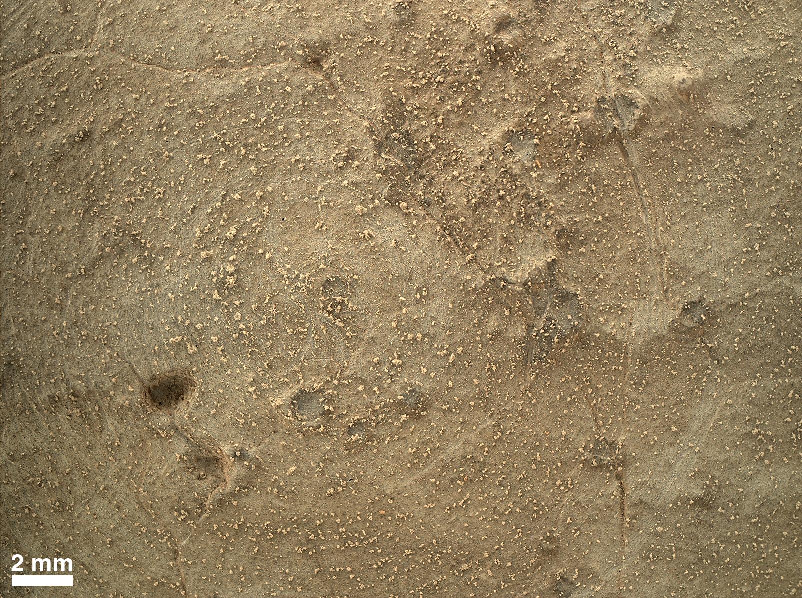 The image, one of the highest resolution images returned so far by MAHLI, was taken from a distance of about 0.4 inch (1 centimeter) from the rock's surface. Fractures, white veins, pits and tiny dark grains in the rock are visible, as well as remaining clumps and specks of dust. The scale bar at lower left is 2 millimeters (0.08 inches).