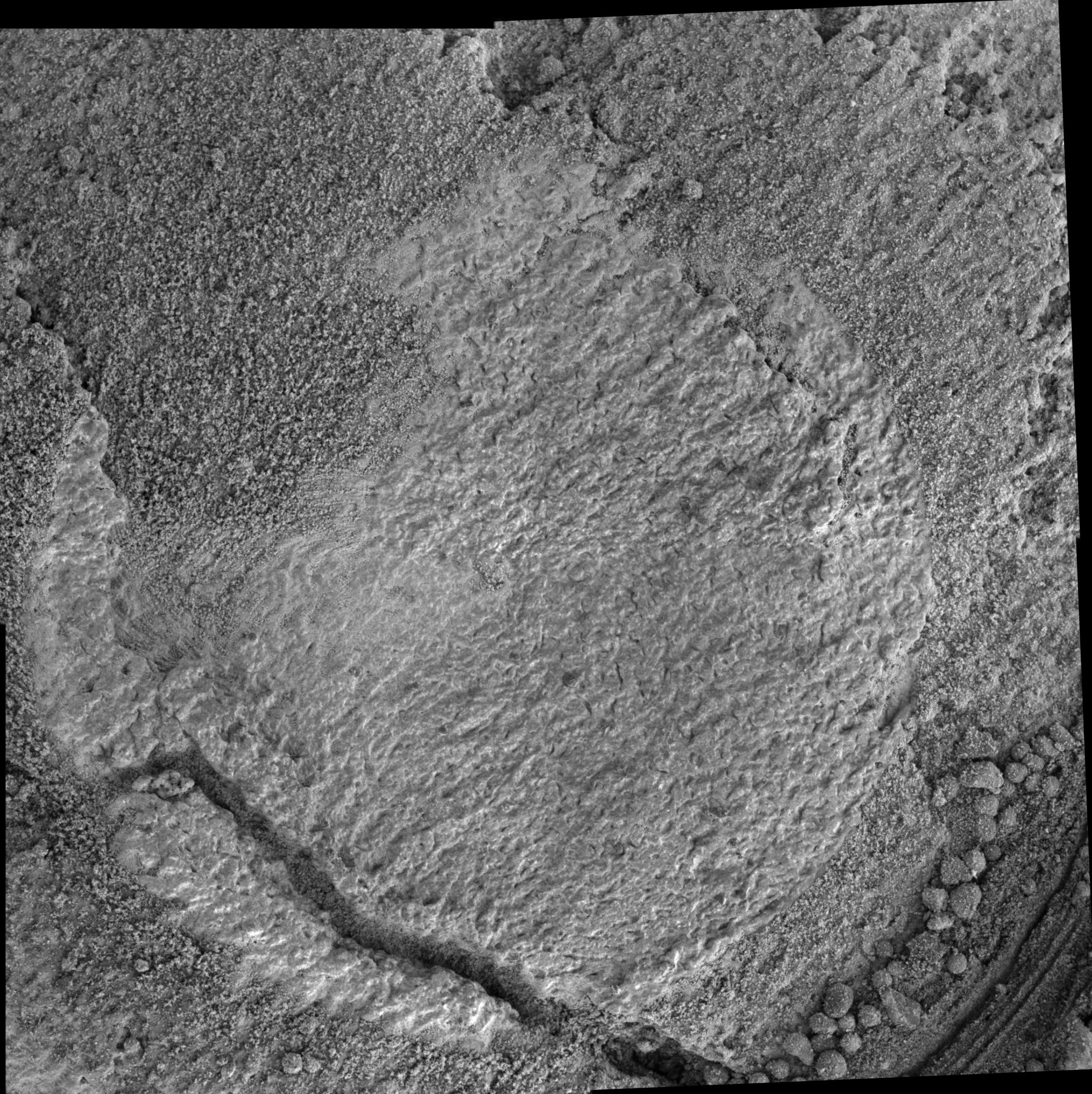 This rock surface exhibits relatively small spherical concretions compared to those observed in the vicinity of "Eagle Crater" and "Endurance Crater." Such small concretions, and in places apparent absence of concretions, have characterized the outcrops south of "Vostok Crater." Also visible in this image are small pits and grooves in the rock surface, including narrow, elongated void spaces different from any previously observed by Opportunity. Crystal-shaped and elongated void spaces that were seen in the vicinity of Eagle and Endurance Craters are interpreted as spaces left by dissolving of soluble salts. However, these features at Cheyenne have a significantly different appearance and the science team is considering a number of alternative hypotheses for their origin.