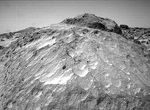 A close-up view of the rock "Moe" in the "Rock Garden" at the Pathfinder landing site. Moe is a meter-size boulder that, as seen from Sojourner, has a relatively smooth yet pitted texture upon close examination. Such a texture is seen on Earth on rocks that have been abraded by wind in a process that is analogous to sand blasting. This view of Moe shows two faces on the rock, one (left side of the rock) facing north-northeast and the other (right side) facing east. These two faces are thought to have been pitted and fluted by strong, "sand"- carrying winds from the northeast.