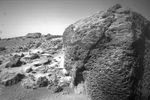 This view of the rock "Chimp" was acquired by the Sojourner rover's right front camera on Sol 74 (September 17). A large crack, oriented from lower left to upper right, is visible in the rock. A dark crust appears to cover Chimp in some areas whereas other parts of the rock have a lighter shading. A boundary between the two regions is clearly seen in the upper left part of Chimp.