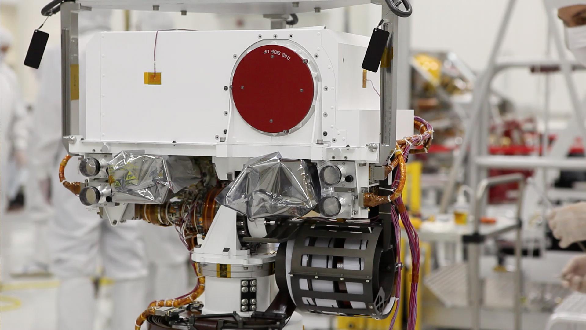 Curiosity's "eyes" (the Mastcam) are shrouded in a silvery material, awaiting their first look around the clean room at NASA's Jet Propulsion Laboratory, where the rover is being built. This image shows a close-up of the rover's "head." At the top is a white box structure with a large red circle (the rover's laser called ChemCam) to the right. Beneath the box are two cameras, which will provide views of the Martian surface.