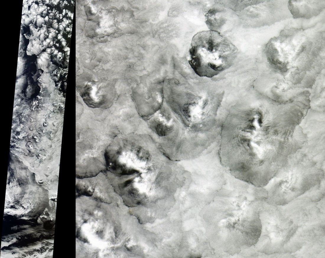 When the cell centers are cloudy and the main sinking motion is concentrated at cell boundaries, the cells are referred to as "closed." The cell diameters in this image range from 40 to 100 kilometers (about twice the average size of closed cells in general) and show an increased brightness at the cell centers, giving them a mogul-like appearance. Because the cloud-top heights do not vary substantially across the cells, the distinctive appearance is more likely due to an increased concentration of cloud droplets at their centers.