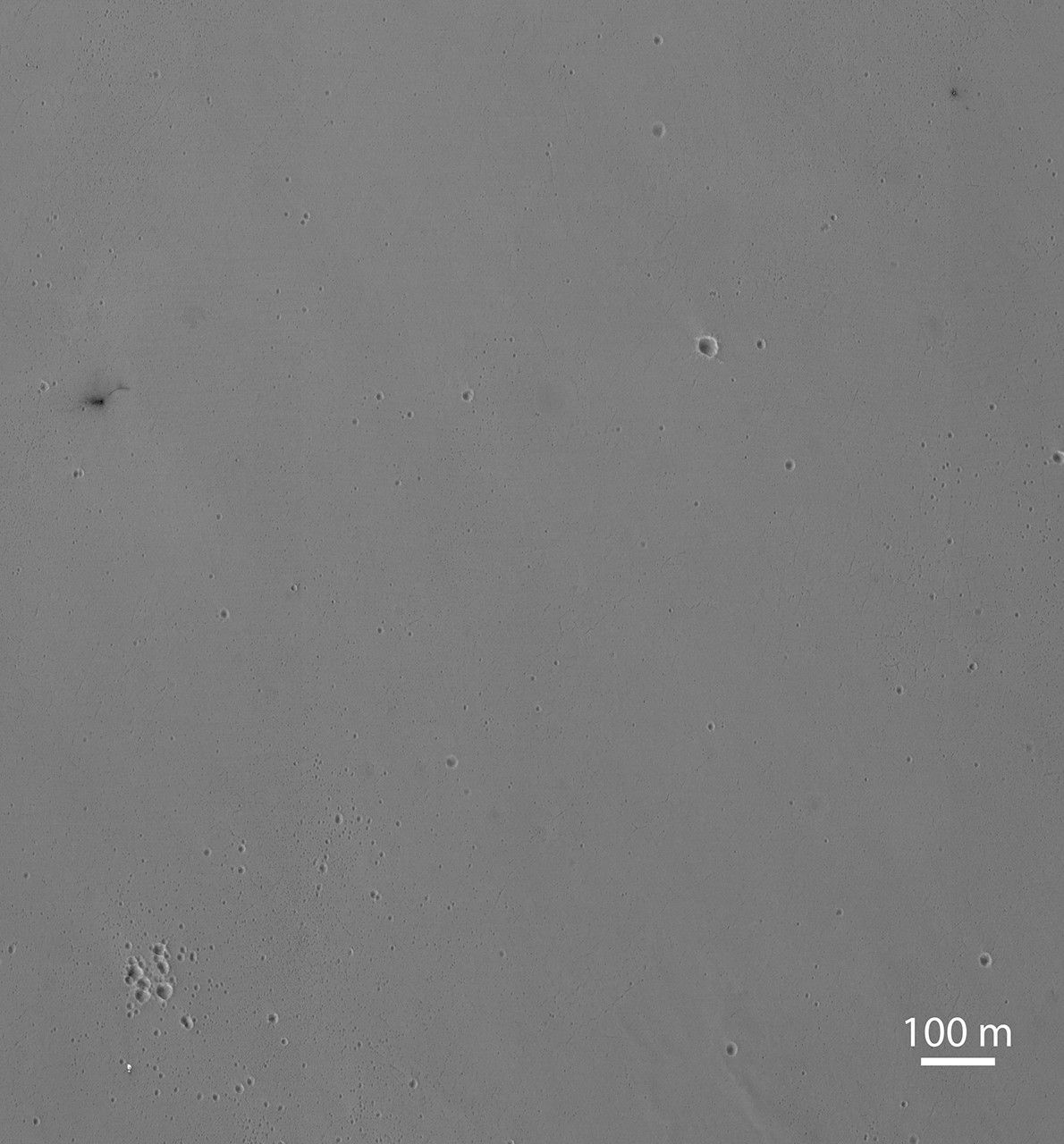 At upper right are several bright features surrounded by dark radial impact patterns, located about where the heat shield was expected to impact. The bright spots may be part of the heat shield, such as insulation material, or gleaming reflections of the afternoon sunlight.