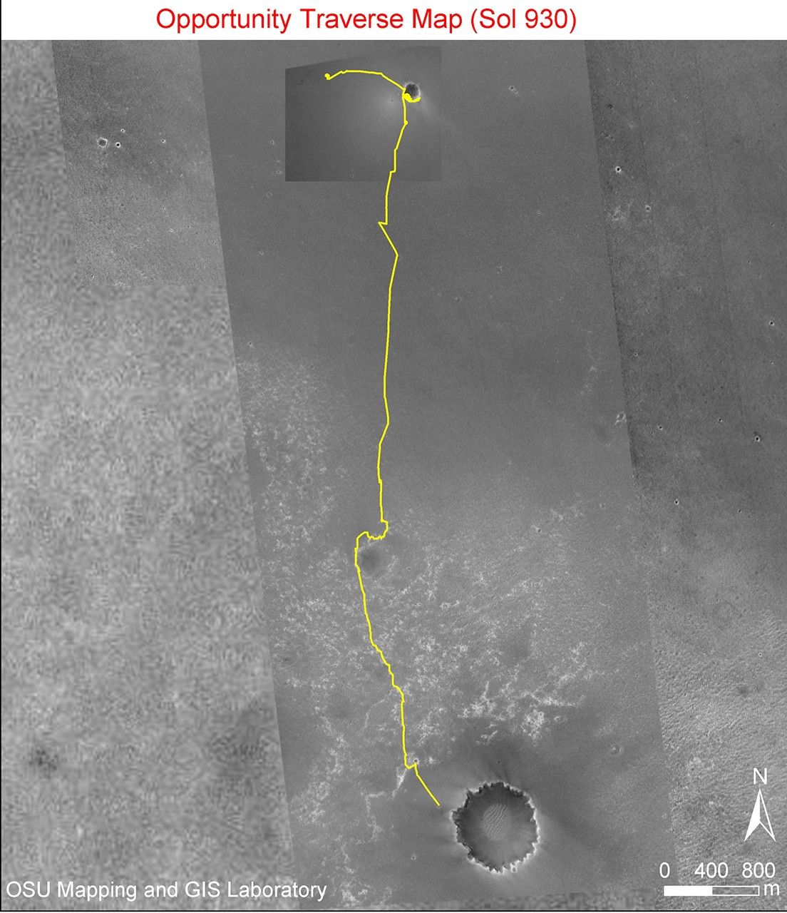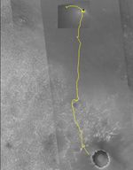 Victoria is the large crater near the bottom of this map made from images taken by the Mars Orbiter Camera on NASA's Mars Global Surveyor. The gold line traces Opportunity's path eastward then southward from "Eagle Crater," where it landed, to Endurance Crater, where it spent six months, and nearly to Victoria. The south end of the line indicates Opportunity's location as of the rover's 930th Martian day, or sol, (Sept. 5, 2006). Victoria is about 750 meters (0.47 mile) in diameter, or about six times wider than Endurance and about 35 times wider than Eagle. The scale bar at lower right shows the length of 800 meters (0.50 mile). North is up.
