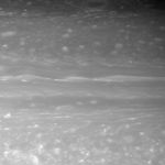A transitional region in Saturn's atmosphere features long, linear cloud shapes, flanked to the north and south by more turbulent swirls. At top center in this view swirls a dark vortex ringed by bright clouds.