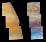 Cloud features north of Jupiter's equator, in the region between 3 and 30 degrees north latitude, are shown in approximately true color (left mosaic) and in false color (right mosaic). The false color is used to reveal the heights and thicknesses of Jupiter's clouds. The left mosaic was taken about 40 minutes after the right mosaic, when the cloud features had rotated with the planet to Jupiter's curved limb. The images were taken by NASA's Galileo spacecraft.