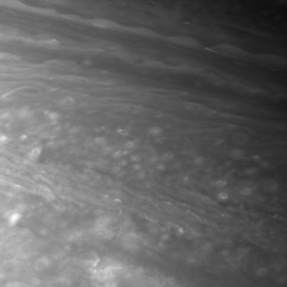 Bright, circular cloud features waltz through the turbid atmosphere of Saturn in this Cassini spacecraft view.