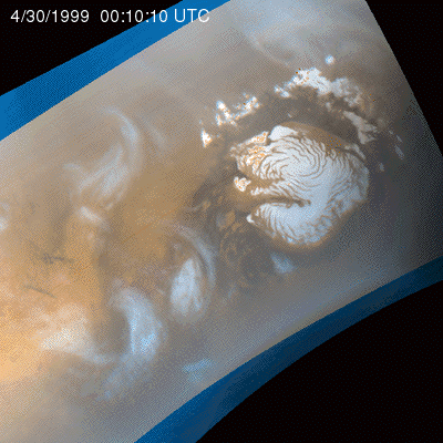 The motion of the clouds viewed in this image is typical for this season on Mars, and shows forms often seen on Earth. Waves of clouds are moving from the upper portion of the frame towards the bottom (towards the east northeast). This motion is most likely the movement of a moister portion of the martian atmosphere under the influence of circumpolar winds. Early in the sequence, a prominent circular band of clouds moves almost due east, rotating slightly counter-clockwise. Towards the end of the sequence, the circle dissipates and a linear set of clouds propagates towards the bottom of the frame. Linear cloud speeds vary from day today, averaging about 16 km/hr (10 miles/hr); rotational rates appear to have been less than 10 km/hr (6 miles/hr).