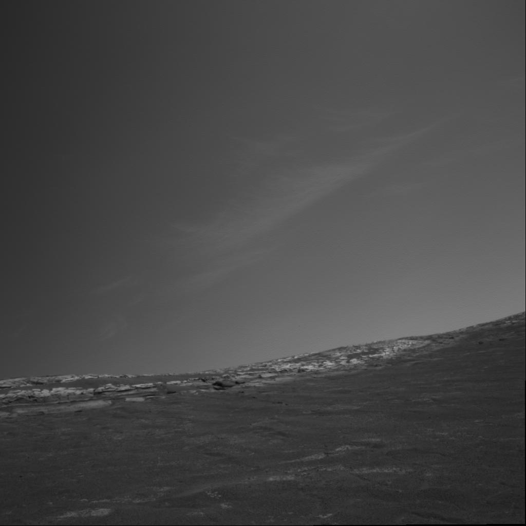 Clouds above the rim of "Endurance Crater" in this image from NASA's Mars Exploration Rover Opportunity can remind the viewer that Mars, our celestial neighbor, is subject to weather. On Earth, clouds like these would be referred to as "cirrus" or the aptly nicknamed "mares' tails." These clouds occur in a region of strong vertical shear. The cloud particles (ice in this martian case) fall out, and get dragged along away from the location where they originally condensed, forming characteristic streamers. Opportunity took this picture with its navigation camera during the rover's 269th martian day (Oct. 26, 2004).