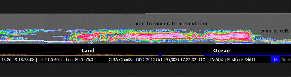 CloudSat overpassed an estimated 137 miles (220 kilometers) to the west of Sandy's storm center, which at the time of the overpass was still over the Atlantic Ocean. The satellite overpassed a wide area of moderate precipitation stretching across New York to coastal North Carolina. Maximum cloud top heights from the CloudSat overpass are estimated at 7.5 to 8 miles (12 to 13 kilometers) in height. The brighter colors (orange, red and light pinks) represent greater intensity of the backscattered radar signal from the satellite. These brighter colors correlate to larger raindrops, heavier precipitation and ice or hail depending on the vertical level. The shades of blues and greens represent smaller amounts water and ice particles that correspond to thinner clouds type (cirrus and anvil tops). A nearly continuous area of light and moderate precipitation stretches across the mid-Atlantic region. Near the surface of these areas of light to moderate precipitation, the radar signal measured by CloudSat isn't as strong due to larger sized water droplets that tend to weaken the strength of the signal. The CloudSat observations are an excellent tool for determining cloud layers and heights, precipitating cloud structures and other cloud properties.