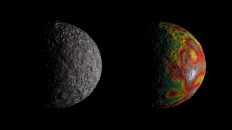 This animation shows Ceres as seen by NASA's Dawn spacecraft from its high-altitude mapping orbit at 913 miles (1,470 kilometers) above the surface. The colorful map overlaid at right shows variations in Ceres' gravity field measured by Dawn, and gives scientists hints about the dwarf planet's internal structure. Red colors indicate more positive values, corresponding to a stronger gravitational pull than expected, compared to scientists' pre-Dawn model of Ceres' internal structure; blue colors indicate more negative values, corresponding to a weaker gravitational pull.