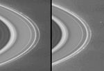 The latest images taken by the Cassini-Huygens spacecraft show clumps seemingly embedded within Saturn's narrow, outermost F ring. The narrow angle camera took the images on Feb. 23, 2004, from a distance of 62.9 million kilometers (39 million miles). The two images taken nearly two hours apart show these clumps as they revolve about the planet. The small dot at center right in the second image is one of Saturn's small moons, Janus, which is 181 kilometers, (112 miles) across.