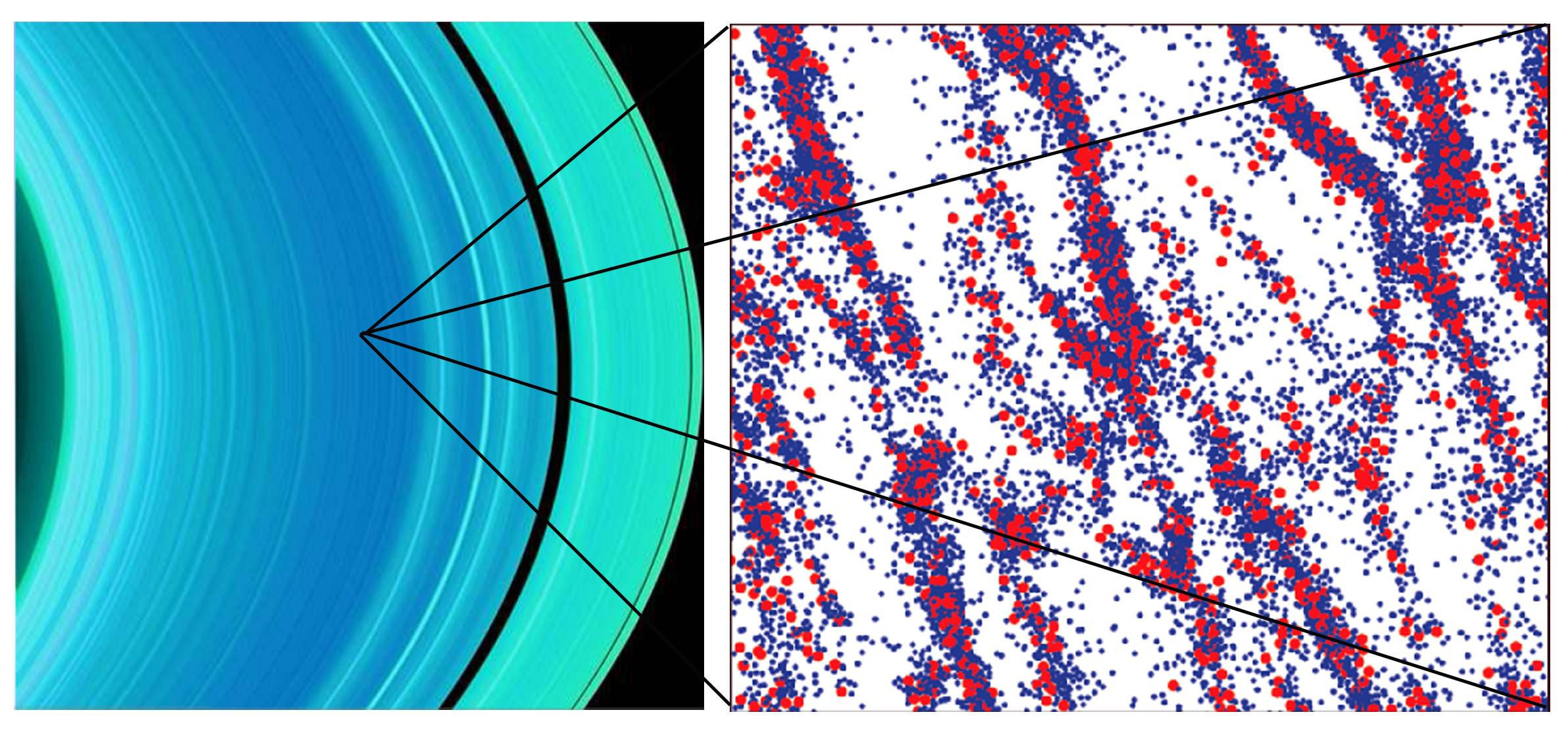 The right image is a computer simulation about 150 meters (490 feet) across illustrating a clumpy region of particles in the A ring. The particles are moving counterclockwise, from bottom to top.