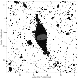 This is a computer simulation of the final stage of the growth of a "clump" in Saturn's rings. The gravity from a hypothesized moonlet (solid gray sphere in frame center) has collected smaller ring particles (black) to form a temporary aggregation. The particles shown in the simulation are from centimeters to meters (inches to yards) across. The gray moonlet is 61 meters (200 feet) across.