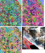 These band composites, acquired on June 4, 2000, cover a 11 by 13.5 km sub-scene in the Coachella Valley, CA. The area is shown by the yellow box on the full scene in the LOWER RIGHT corner, northwest of the Salton Sea. This is a major agricultural region of California, growing fruit and produce throughout the year. Different combinations of ASTER bands help identify the different crop types. UPPER LEFT: bands 3, 2, 1 as red, green, and blue (RGB); UPPER RIGHT: bands 4, 2, 1 as RGB; LOWER LEFT: bands 4, 3, 2 as RGB. The image is centered at 33.6 degrees north latitude, 116.1 degrees west longitude.