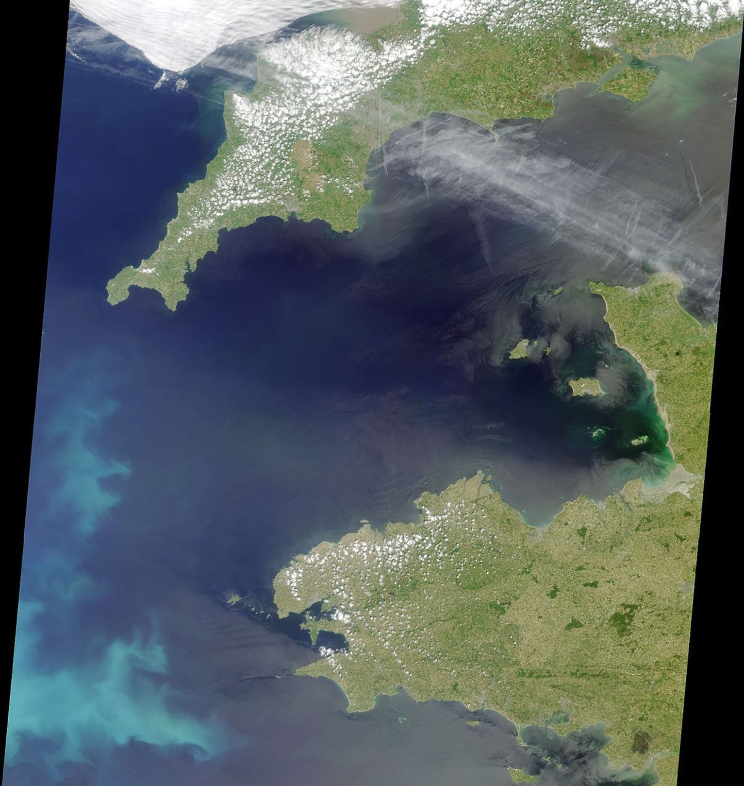 At full resolution, evidence of human activity is also apparent in this image. White specks associated with ship wakes are present in the open water, and aircraft contrails are visible within the high cirrus clouds over the English Channel.