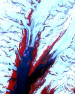 This image covers an area 20 kilometers (13 miles) wide and 24 kilometers (15 miles) long in three bands of the reflected visible and infrared wavelength region. College Fjord is located in Prince Williams Sound, east of Seward, Alaska. Vegetation is in red, and snow and ice are white and blue. Ice bergs calved off of the glaciers can be seen as white dots in the water. At the head of the fjord, Harvard Glacier (left) is one of the few advancing glaciers in the area; dark streaks on the glacier are medial moraines: rock and dirt that indicate the incorporated margins of merging glaciers. Yale Glacier to the right is retreating, exposing (now vegetated) bedrock where once there was ice. On the west edge of the fjord, several small glaciers enter the water. This fjord is a favorite stop for cruise ships plying Alaska's inland passage.