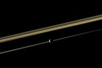 Mimas (396 kilometers, or 246 miles across) is closest to the Cassini spacecraft here. Epimetheus (113 kilometers, or 70 miles across) is on the far side of the rings. Saturn's shadow cuts across the middle of the rings. This view looks toward the sunlit side of the rings from just above the ringplane.