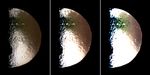 North on Iapetus is approximately up in these images. The images were taken with the Cassini spacecraft narrow-angle camera on Oct. 15, 2004. The view was obtained at a distance of approximately 1.2 million kilometers (746,000 miles) from Iapetus and at a Sun-Iapetus-spacecraft, or phase, angle of 88 degrees. Image scale is 7 kilometers (4 miles) per pixel. The diameter of Iapetus is 1,471 kilometers (914 miles).