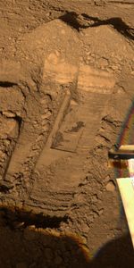 This image was acquired by NASA's Phoenix Mars Lander's Surface Stereo Imager on the 31st Martian day of the mission, or Sol 31 (June 26, 2008), after the May 25, 2008 landing. This image shows the trenches informally called "Snow White 1" (left), "Snow White 2" (right), and within the Snow White 2 trench, the smaller scraping area called "Snow White 3." The Snow White 3 scraped area is about 5 centimeters (2 inches) deep. The dug and scraped areas are within the diggiing site called "Wonderland."