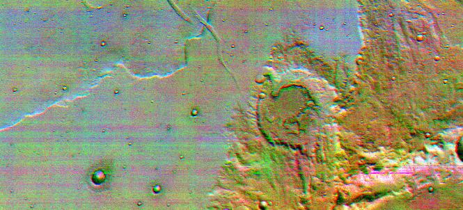 One of the imaging system's major objectives will be using color infrared images to make global mineral maps. This image was processed to enhance the infrared color differences and contains many artifacts that will be removed with further processing. This image covers an area about 32 by 66 kilometers (20 by 40 miles) in size. It is centered near 35.5 degrees south, 141.5 degrees west, and was taken on February 19, 2002 at about 3:15 p.m. local Martian time. North is to the left.