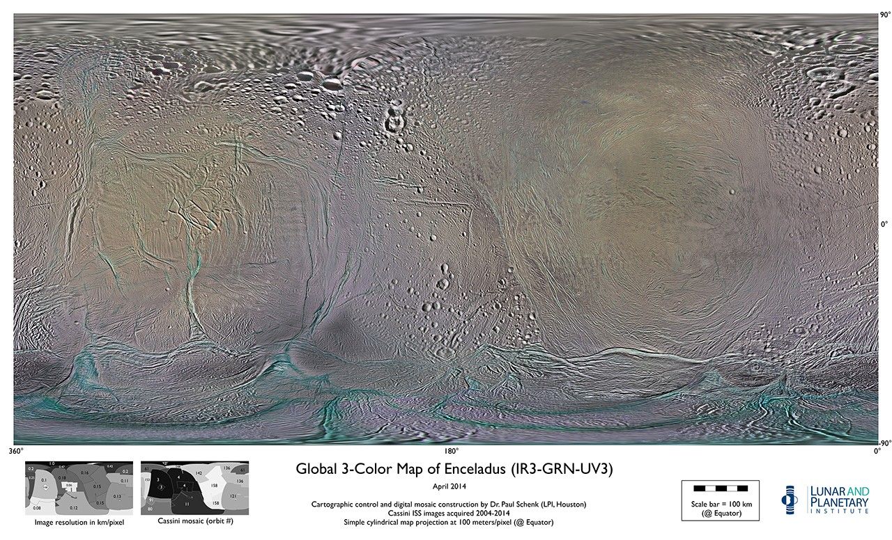 Resolution on Enceladus in the maps is 100 meters per pixel.