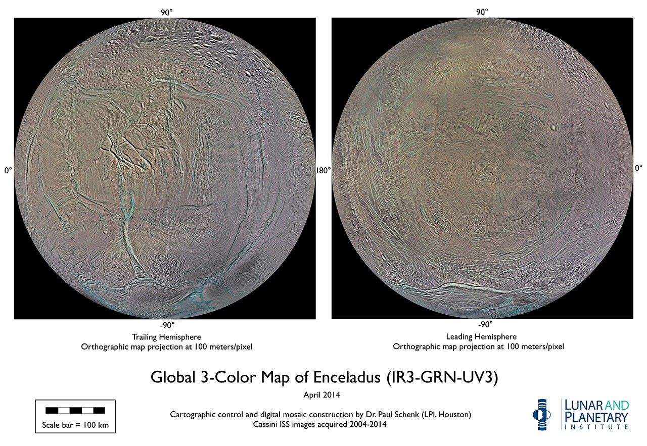 This set of global, color mosaics of Saturn's moon Enceladus was produced from images taken by NASA's Cassini spacecraft during its first ten years exploring the Saturn system. These are the first global color maps of these moons produced from the Cassini data.