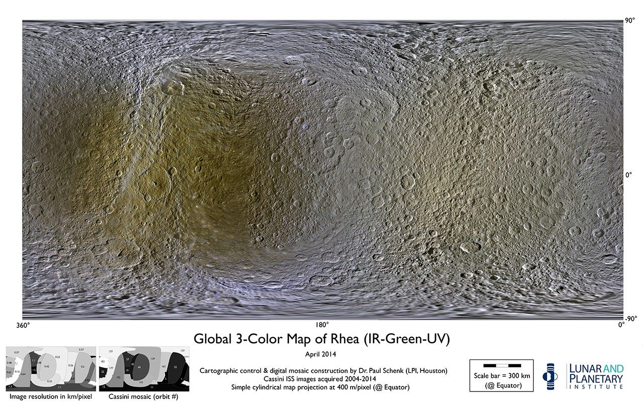 Resolution on Rhea in the maps is 400 meters per pixel.