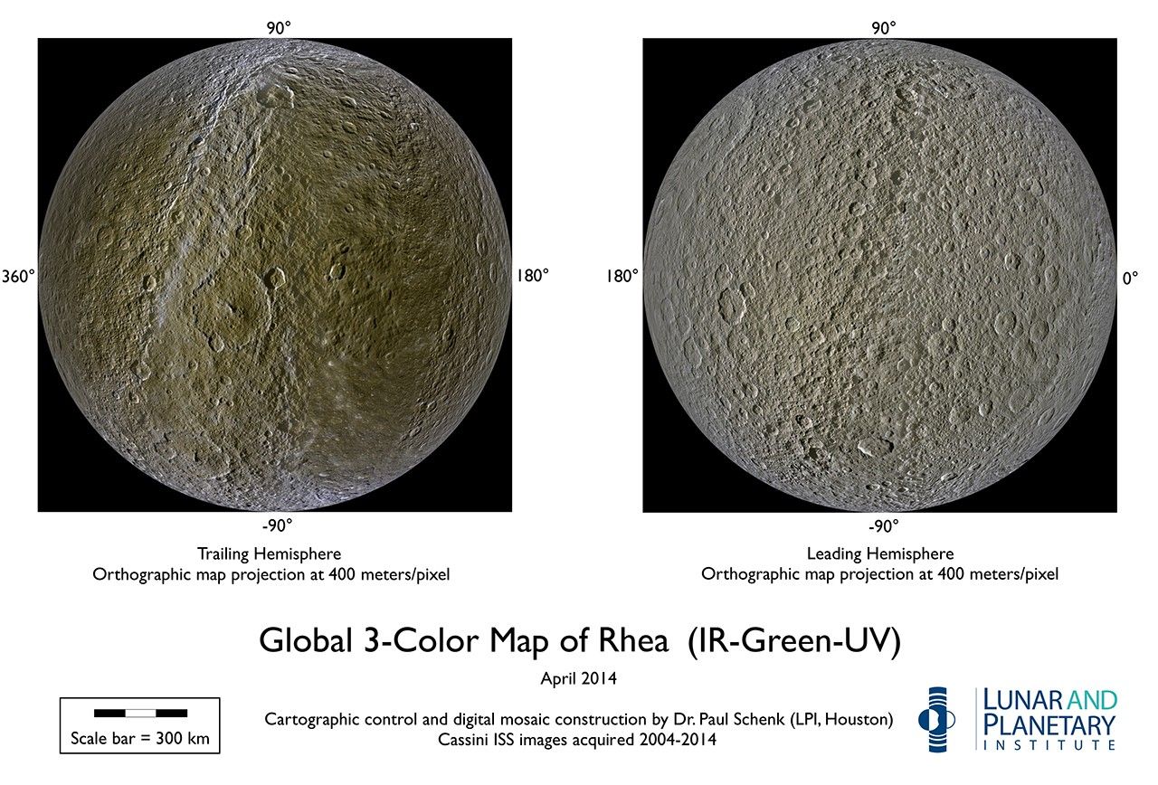 The most obvious feature on the maps is the difference in color and brightness between the two hemispheres. The darker colors on the trailing hemispheres are thought to be due to alteration by magnetospheric particles and radiation striking those surfaces. The lighter-colored leading hemisphere is coated with icy dust from Saturn's E-ring, formed from tiny particles ejected from Enceladus' south pole. These satellites are all being painted by material erupted by neighboring Enceladus.