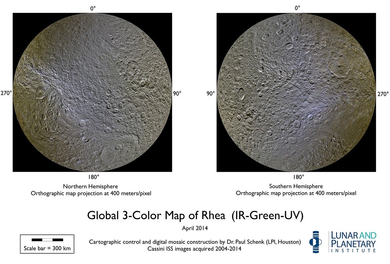 This set of global, color mosaics of Saturn's moon Rhea was produced from images taken by NASA's Cassini spacecraft during its first ten years exploring the Saturn system. These are the first global color maps of these moons produced from the Cassini data.