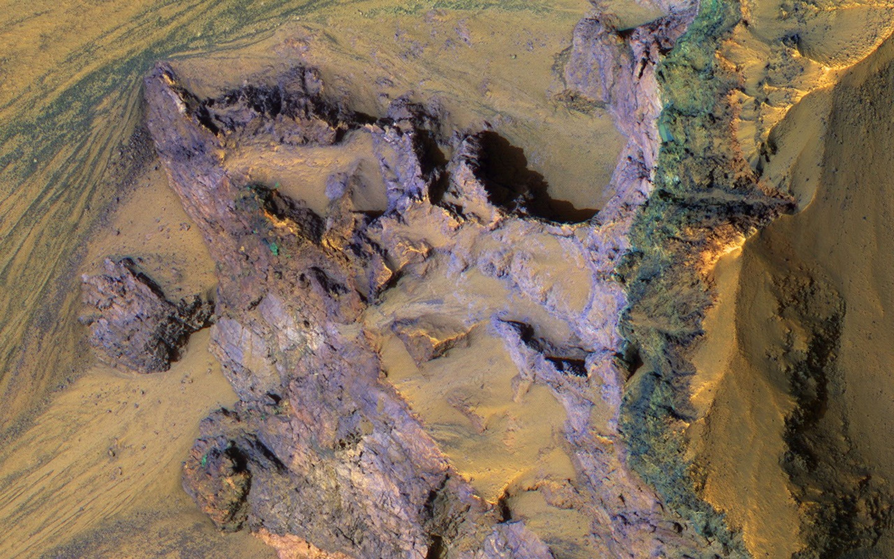 The steep walls of Valles Marineris sometimes fail, creating giant landslides. This provides a clean exposure of the underlying bedrock.