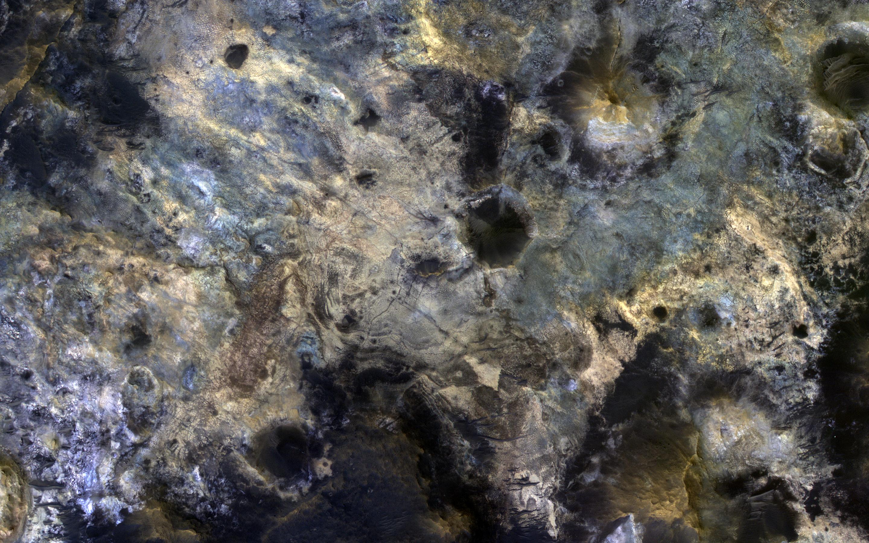 In this image, the enhanced black colors are most likely basaltic sands and rocks, while the green, yellow, and blue colors correspond to the different hydrated minerals.